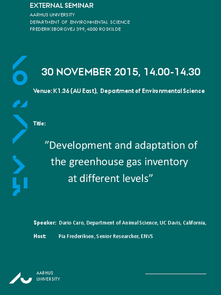 External Seminar: Dario Caro, Department of Animal Science, UC Davis, California Title: ”Development and adaptation of the greenhouse gas inventory at different levels”. Oplysninger om arrangementet Tidspunkt Mandag 30. november 2015, kl. 14:00 - 14:30 Tilføj til kalender Sted K1.36 (AU East), AU Roskilde Arrangør ENVS Af Klaus Condé Christensen Read the invitation here