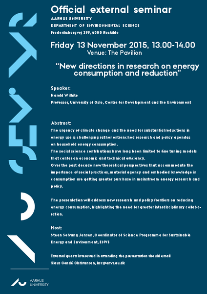 External Seminar: Harold Wilhite, Professor, University of Oslo, Centre for Development and the Environment Title: “New directions in research on energy consumption and reduction” Oplysninger om arrangementet Tidspunkt Fredag 13. november 2015, kl. 13:00 - 14:00 Tilføj til kalender Sted The Pavillon, AU Roskilde Arrangør ENVS Af Klaus Condé Christensen Read the invitation hereRead the abstract hereRead about Harold Wilhite here