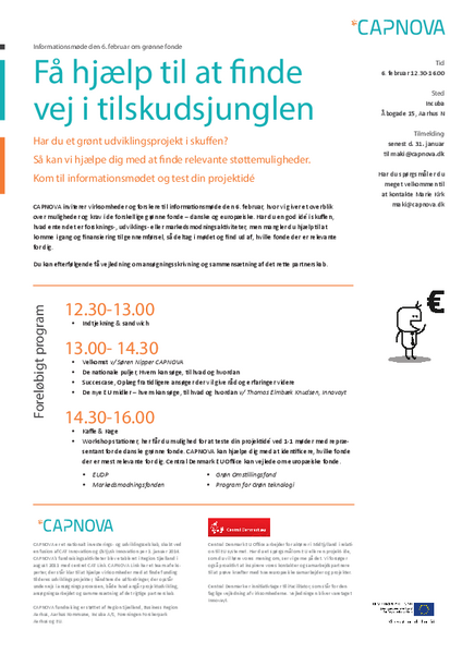 CAPNOVA inviterer virksomheder og forskere til informationsmøde den 6. februar, hvor vi giver et overblik over muligheder og krav i de forskellige grønne fonde – danske og europæiske. Har du en god idé i skuffen, hvad enten det er forsknings-, udviklings- eller markedsmodningsaktiviteter, men mangler du hjælp til at komme i gang og finansiering til gennemførsel, så deltag i mødet og find ud af hvilke fonde der er relevante for dig.