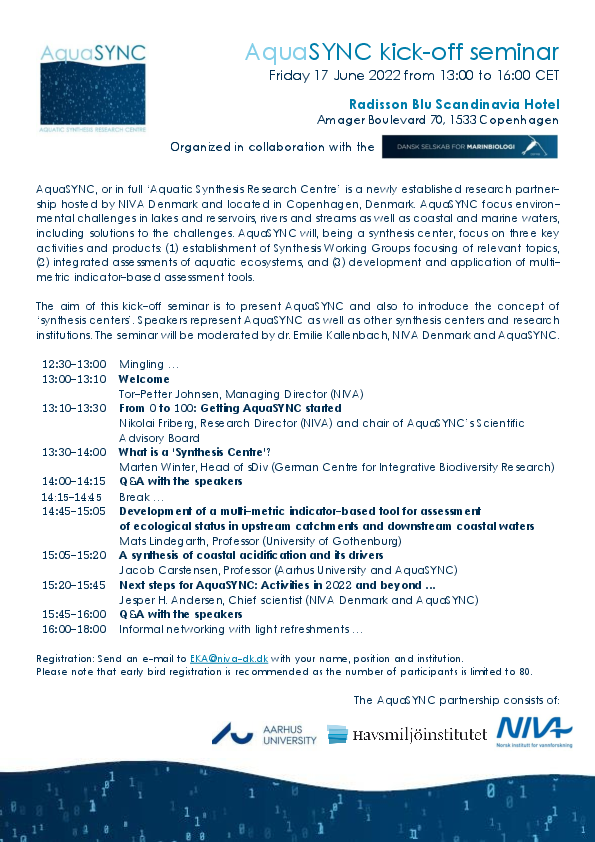 The aim of this kick-off seminar is to present AquaSYNC and also to introduce the concept of ‘synthesis centers’. Speakers represent AquaSYNC as well as other synthesis centers and research institutions. The seminar will be moderated by dr. Emilie Kallenbach, NIVA Denmark and AquaSYNC.