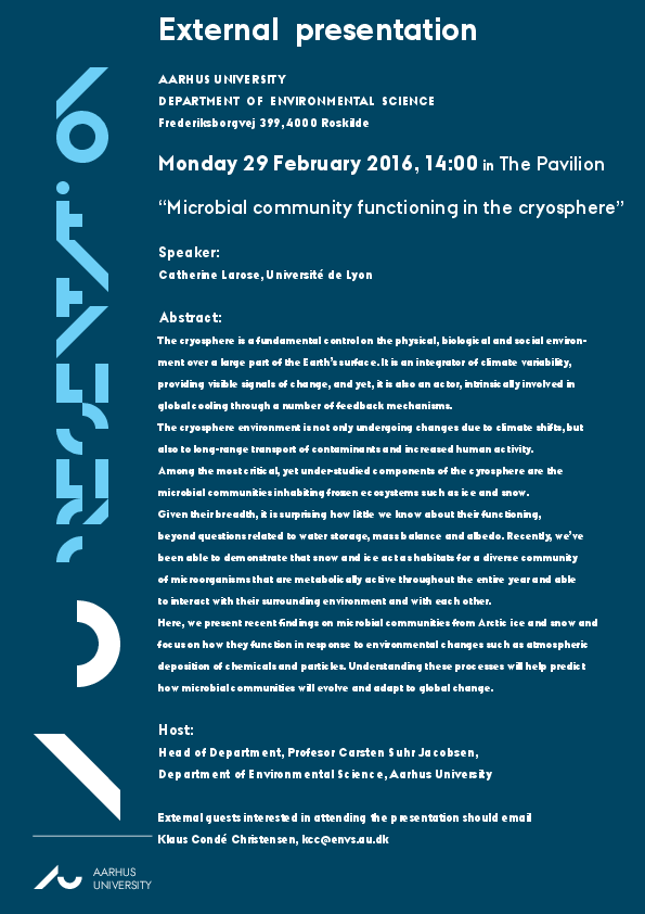 External presentation: Catherine Larose, Université de Lyon Title: “Microbial community functioning in the cryosphere”. Info about event Time Monday 29 February 2016, at 14:00 - 15:00 Add to calendar Location The Pavillon, AU Roskilde Organizer ENVS By Klaus Condé Christensen Read the invitation here