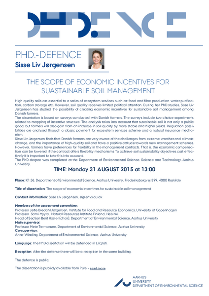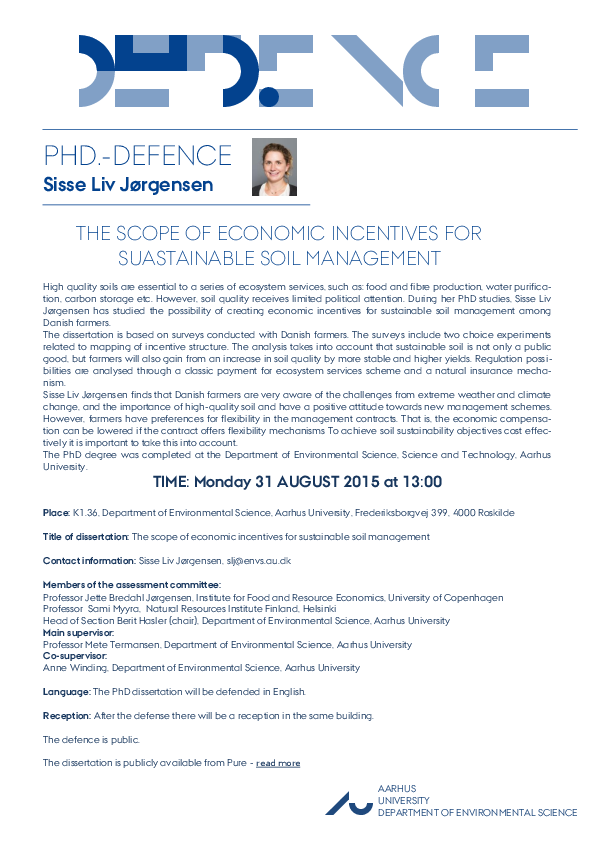 Ph.d.-forsvar / Ph.d.-defence - Sisse Liv Jørgensen Title of dissertation: The scope of economic incentives for sustainable soil management Info about event Time Monday 31 August 2015, at 13:00 - 16:00 Add to calendar Location K1.36, Aarhus Universitet, Roskilde Organizer Institut for Miljøvidenskab, Aarhus Universitet By Klaus Condé Christensen Read the invitation to Sisse Liv Jørgensens ph.d.-defence here